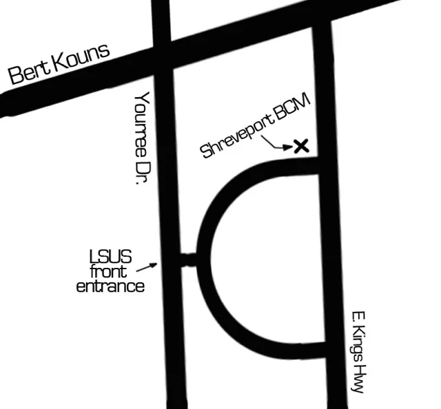 SHV BCM is located at the back corner of LSUS at the corner of University Drive & East Kings Highway